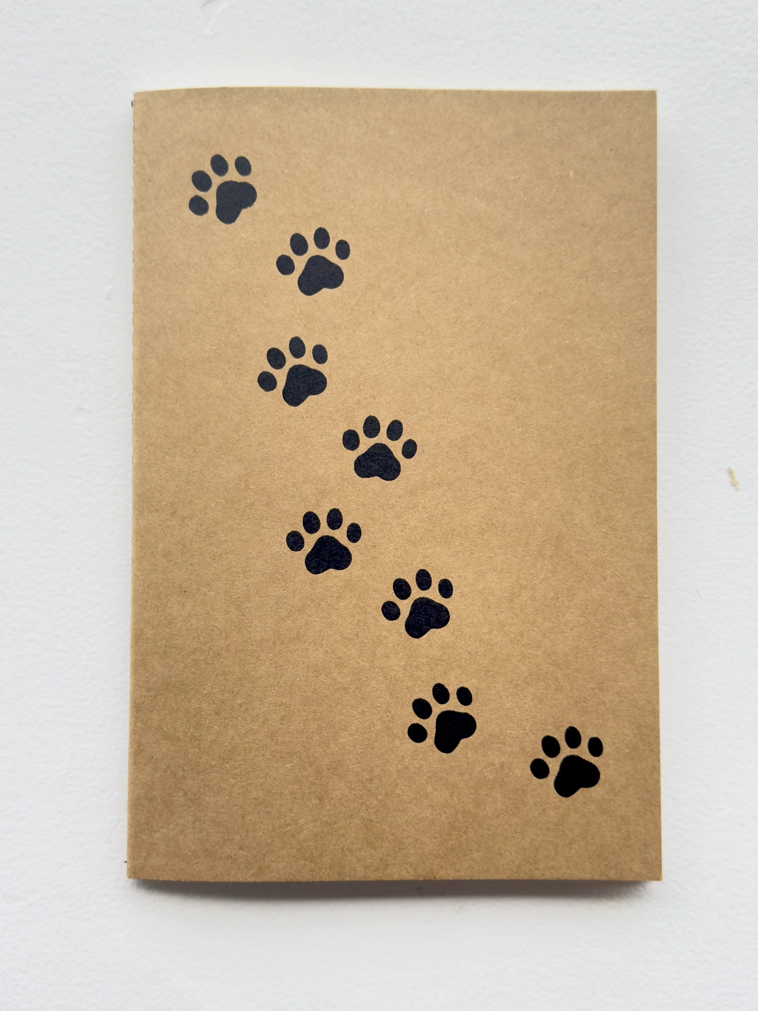 Installation view; family portraits, dog and cat bowls and notebooks at Arthaus Contemporary
